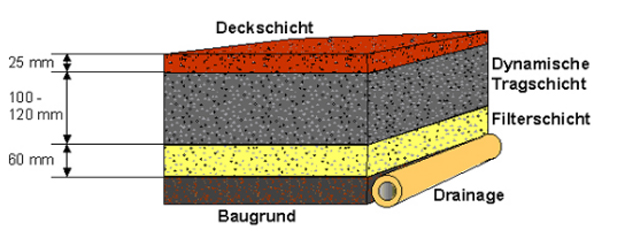 Die herkömmliche Bauweise von Tennisplätzen gem. DIN 18035 Teil 5 besteht aus der Tennisdecke (Ziegelmehl der Körnung K 0/2 sowie Lava der Körnung K 0/16)