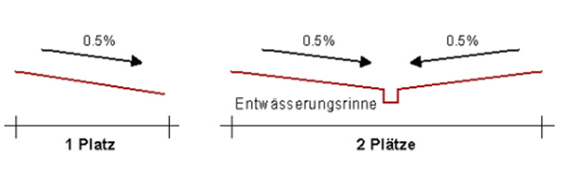 Tennisplätze werden gem. DIN 18035 Teil 5 mit einem Quergefälle von 0,5 % erstellt, damit bei Regen das überflüssige Oberflächenwasser über eine Ablaufrinne abgeleitet werden kann.