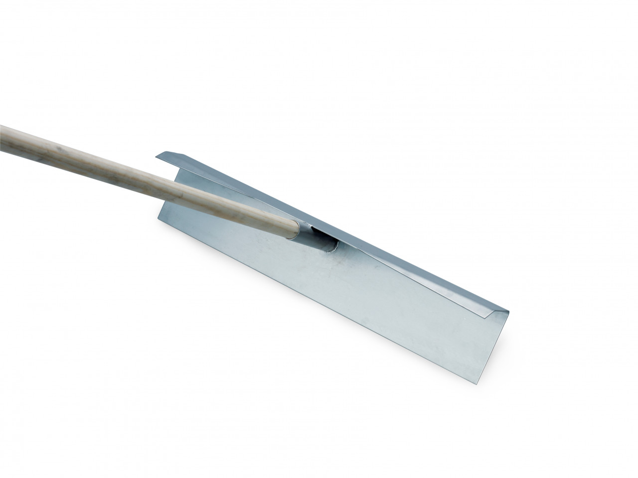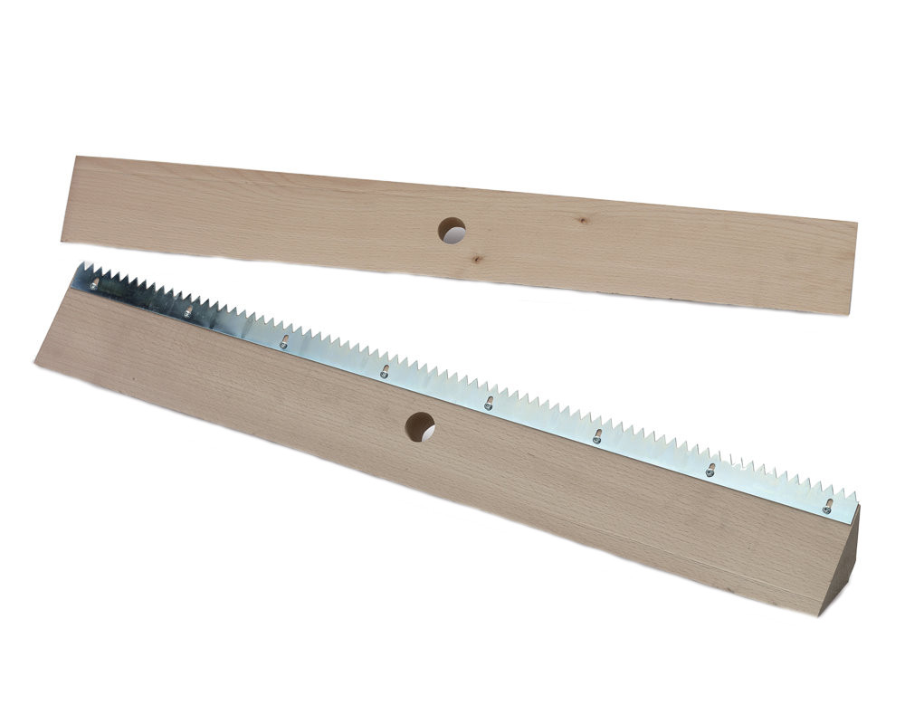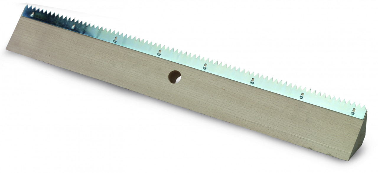 Hierbei hilft unser Allrounder das Scharrierholz ungemein. Sie können dieses Scharrierholz von beiden Seiten nutzen. Für harte Verkrustungen, wie Moos oder Verklebungen nutzen Sie das Scharrierholz mit Sägeblatt um das Altmaterial abzukratzenDrehen Sie nun das Dreikant-Holz um können Sie die Unebenheiten verfüllen. Die Ziegelmehldecke können Sie durch ziehen lockern und mit leichtem Druck schieben sie das Material und verteilen dieses weider. Das Sägeblatt aus Alumium kann bei hoher Abnutzung durch lösen der Schrauben einfach ausgetauscht werden.  Mit ca. 70 cm Länge und 9 cm Breite, sowie einer Höhe des „Dreiecks“ von ca. 4 cm ist das Scharrierholz eine extra Breite Aufsührung.